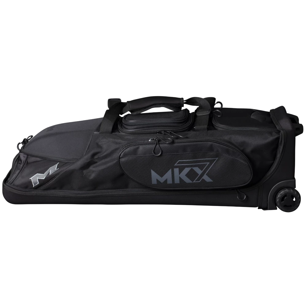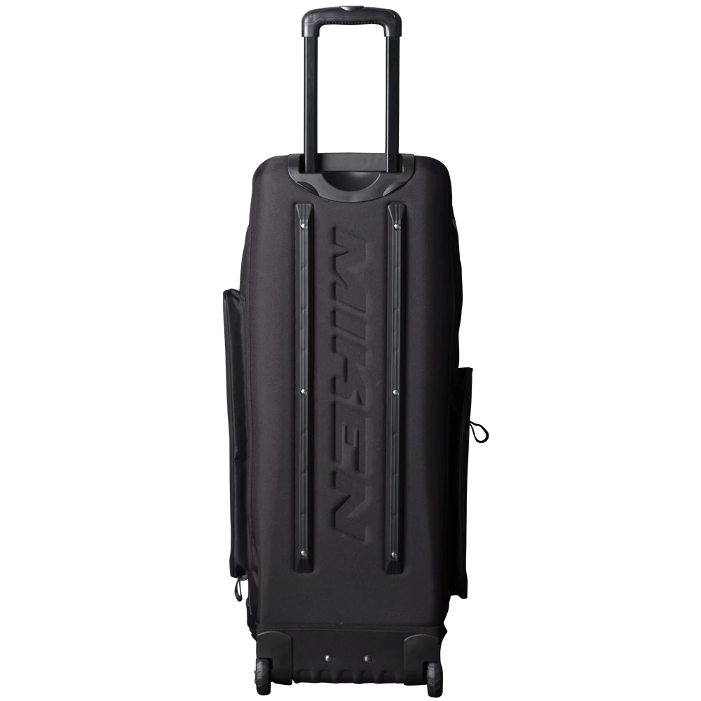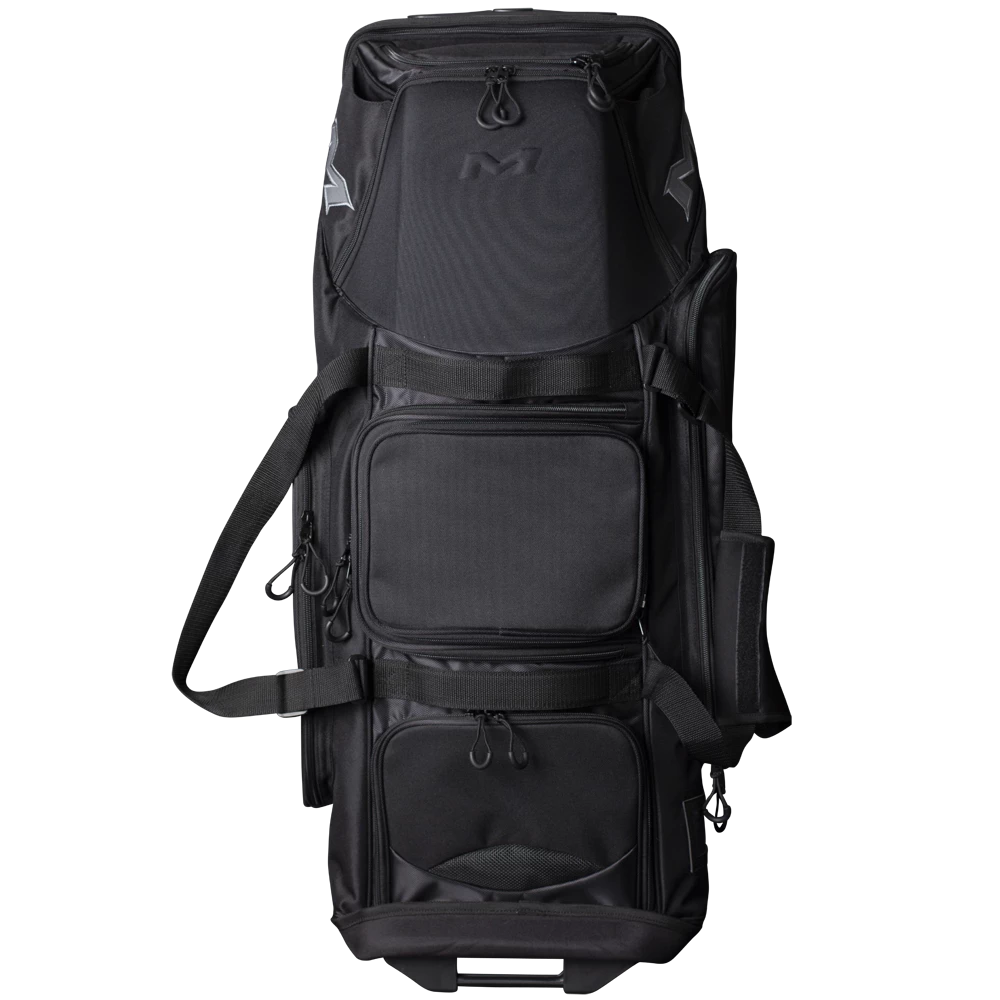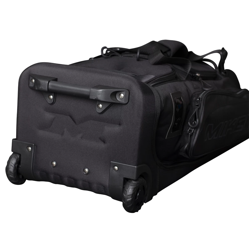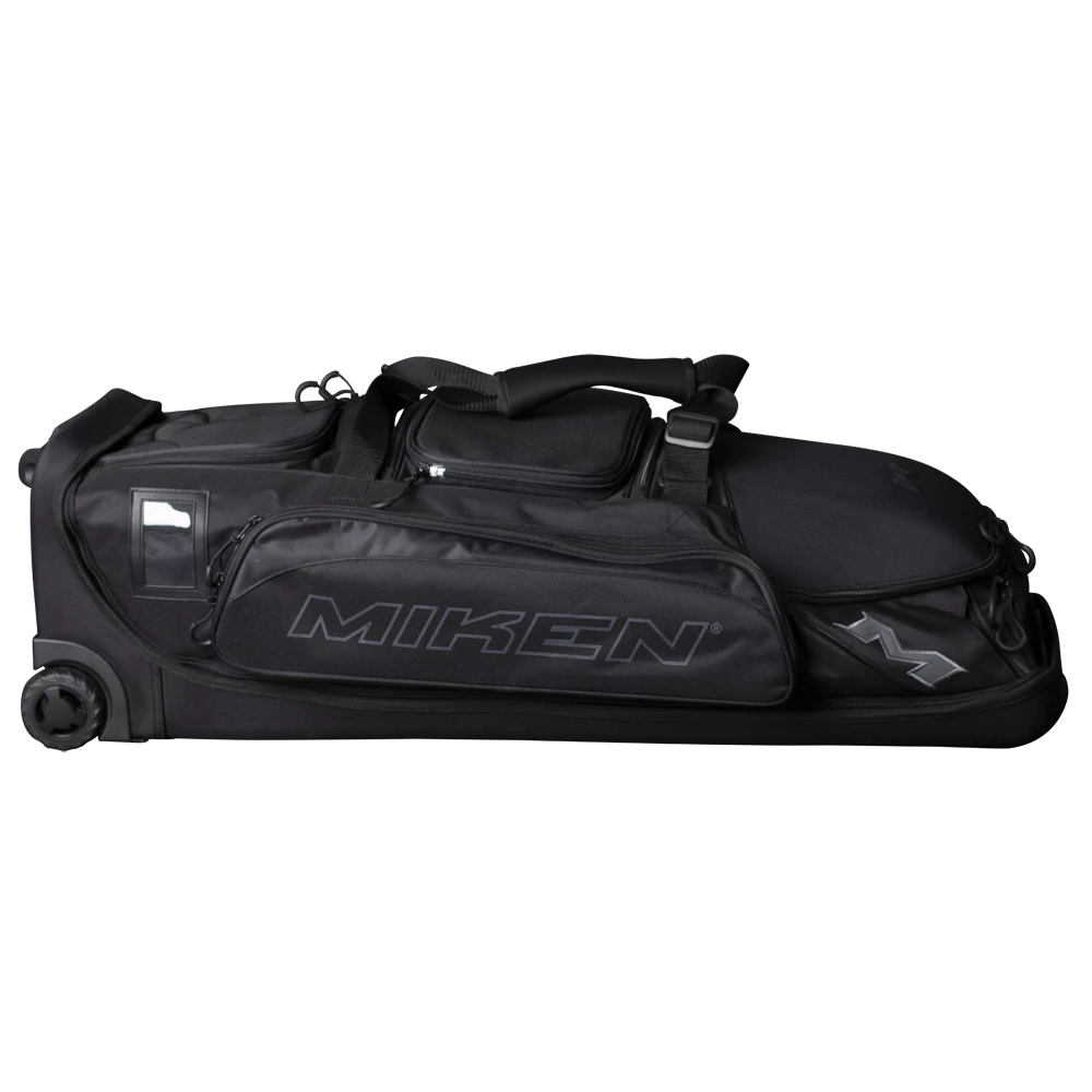 The all new Miken Pro Wheeled Bag features a a padded 4 individual bat compartment,, a telescoping handle, Wide set tank wheels with full EVA base for the ultimate support and durability, a vented shoe compartment, extra large main compartment and 2 smaller compartments, molded top converts to a shelf, removable decoration panel for customization, easy grip handles, clear ID window and durable “J” style hook.