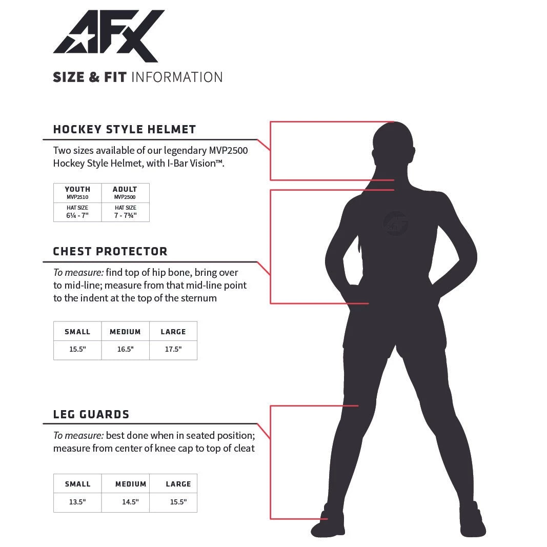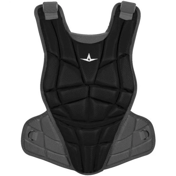 All star chest protectors are measured from the top of the sternum (below the collar) to a player’s navel.